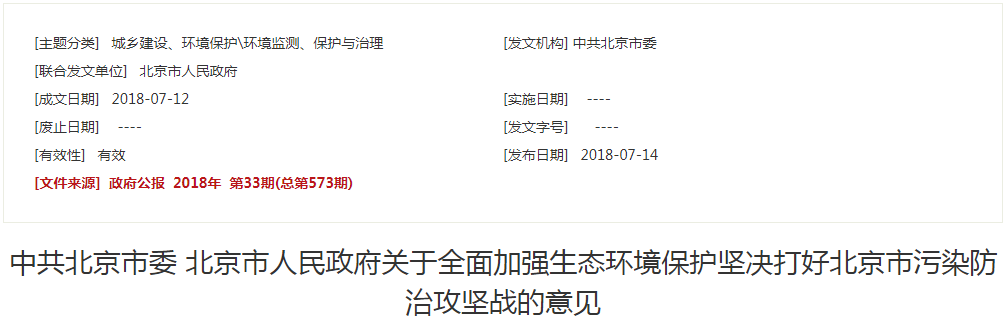2018年7月14日发布的《中共北京市委北京市人民政府关于全面加强生态环境保护坚决打好北京市污染防治攻坚战的意见》(以下简称《意见》)