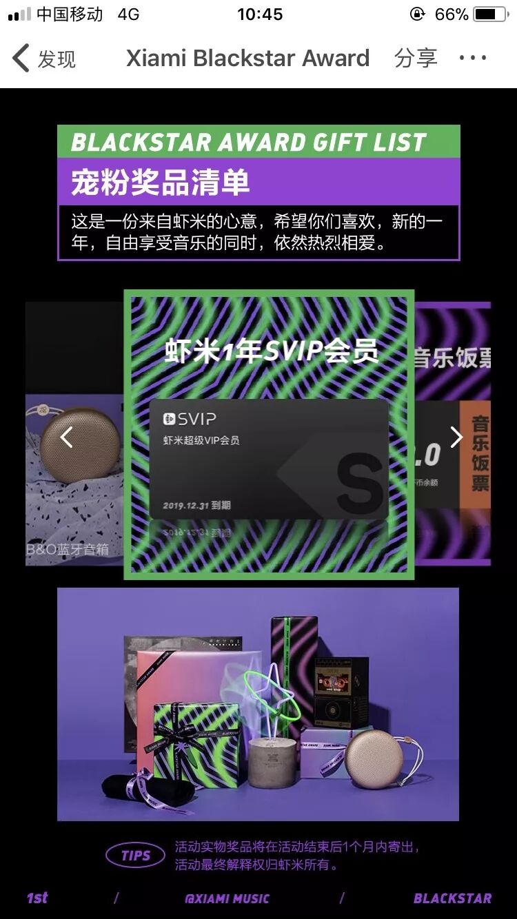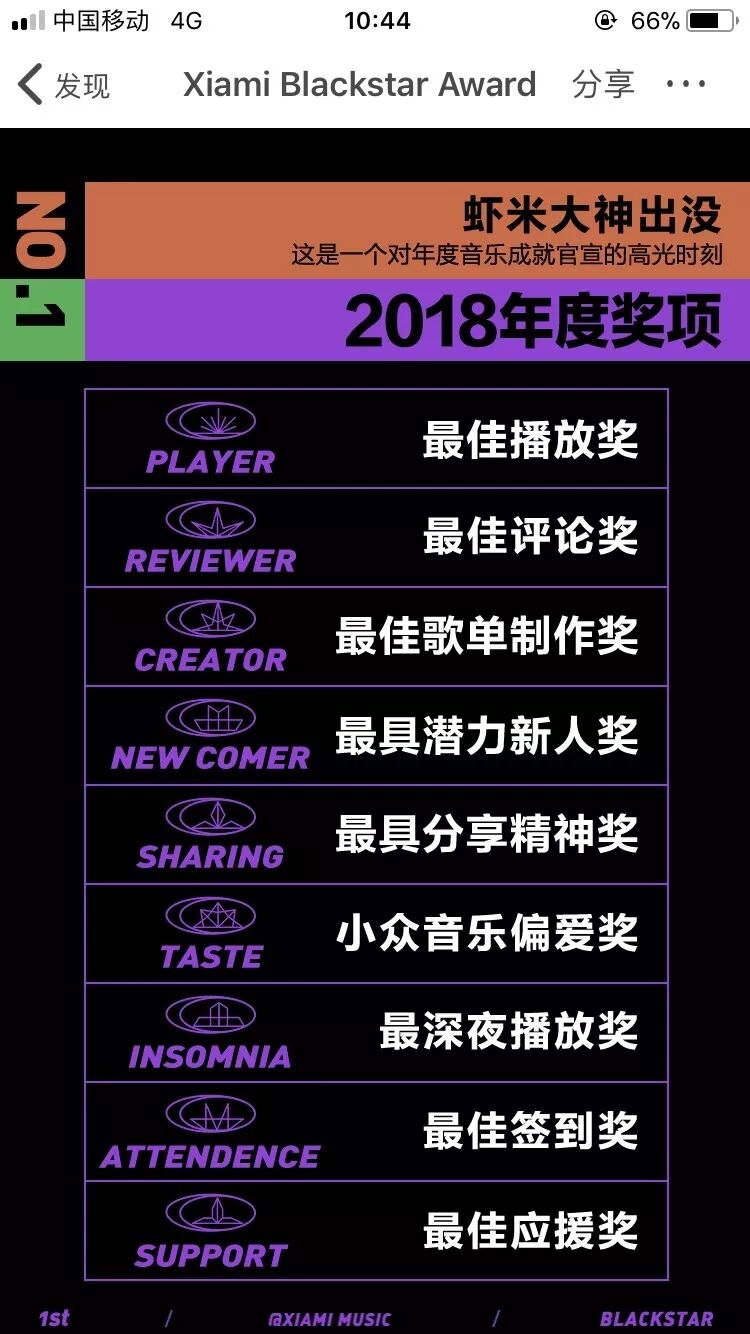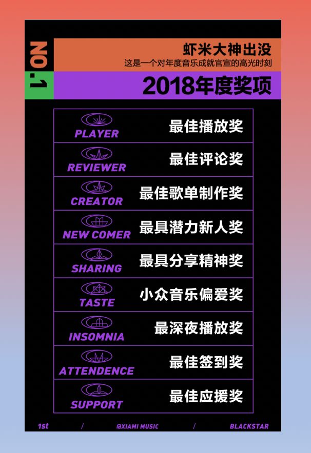 但其实在一段健康的使用关系里,用户同样付出了时间、心力,甚至创造了很多内容。虾米敏锐地捕捉到了这一点,看BLACKSTAR AWARD(黑星奖)的奖项命名就知道。