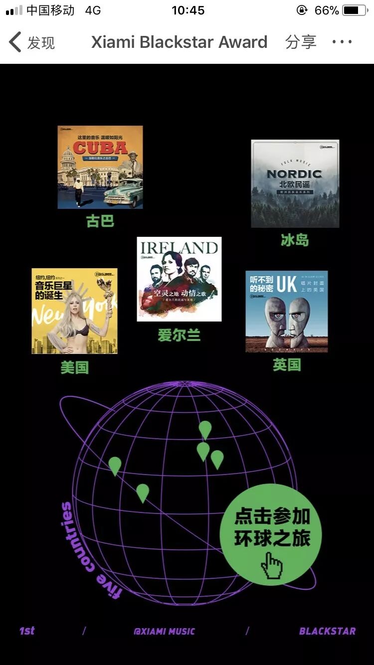 玩法上,算是阿里系今年玩得很溜的“锦鲤附体”。但虾米音乐还是“倔强”地加了许多乐迷老粉们能懂的料儿。这五个国家并不是没来由的设定,而是从深受粉丝喜欢的“环球音乐地图”系列专题精挑细选出的特色国家。