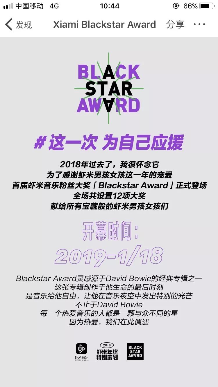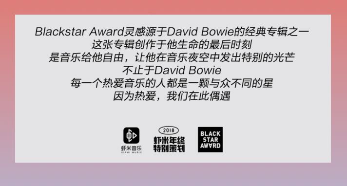 品哥其实对于#虾米年度粉丝大奖#奖项的英文名字BLACKSTAR AWARD(黑星奖),不是很get。后来看了H5内文文案之后,才明天原来是源自于DavidBowie的故事。