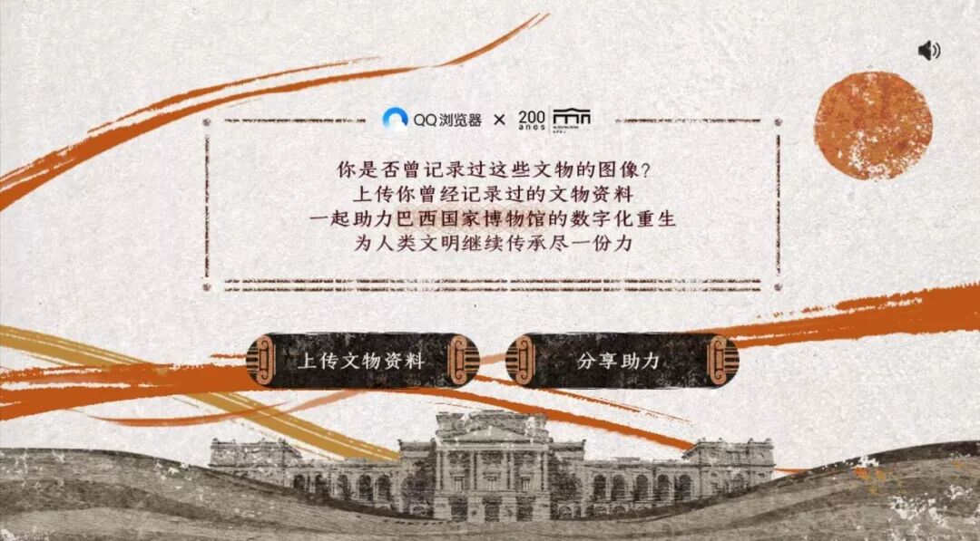 在H5的最后,QQ浏览器和腾讯博物官巧妙地设计了一个用户互动环节,通过不断闪现的记忆碎片唤醒用户对巴西国家博物馆的记忆,号召用户上传文化线索,助力文物的数字保护。