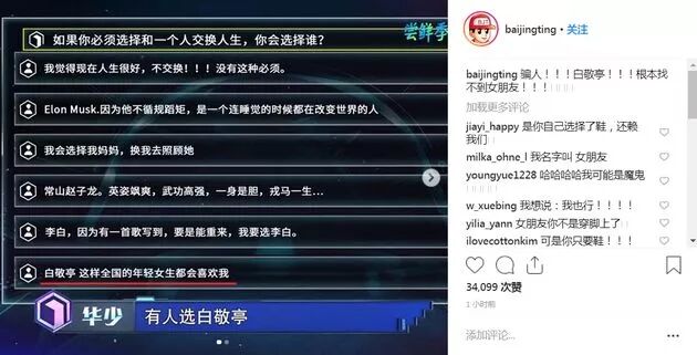 原来是某节目现场有道选择题,其中一个选项是“选择和白敬亭交换人生,这样全国的年轻女生都会喜欢我”。我们白白看到这条之后,直呼“骗人!!白敬亭!!根本找不到女朋友!”