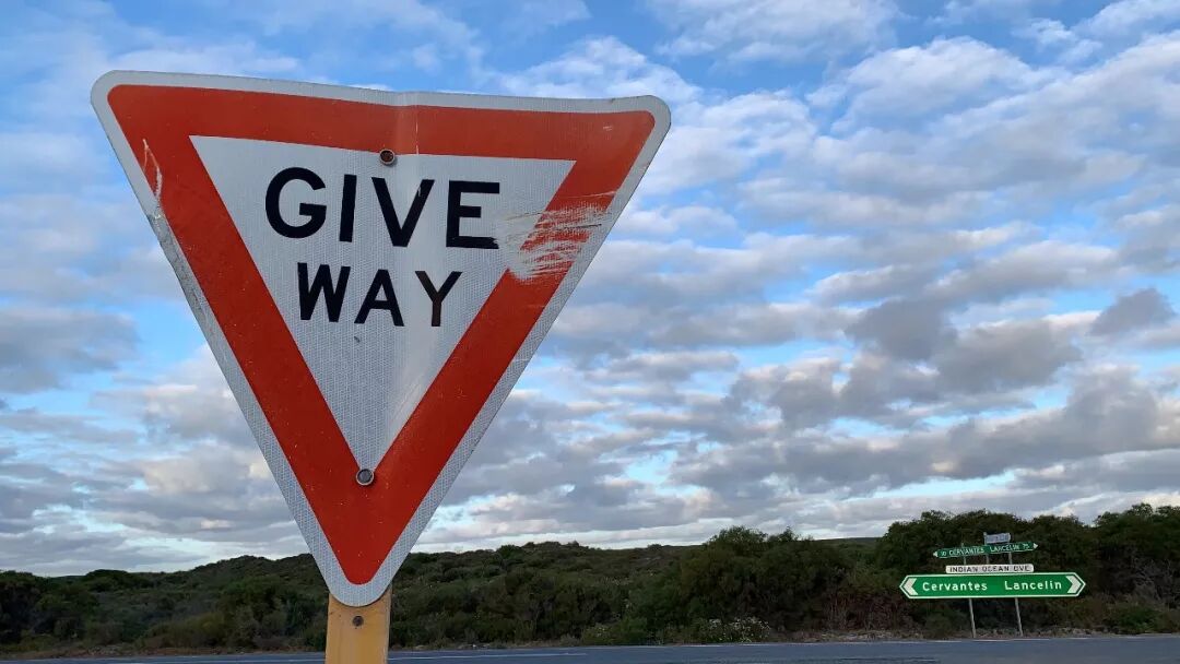 国外很多路口没有红绿灯,看到GIVE WAY的路牌,要停一下让路,确定没车再走。