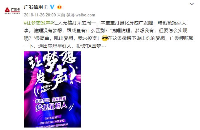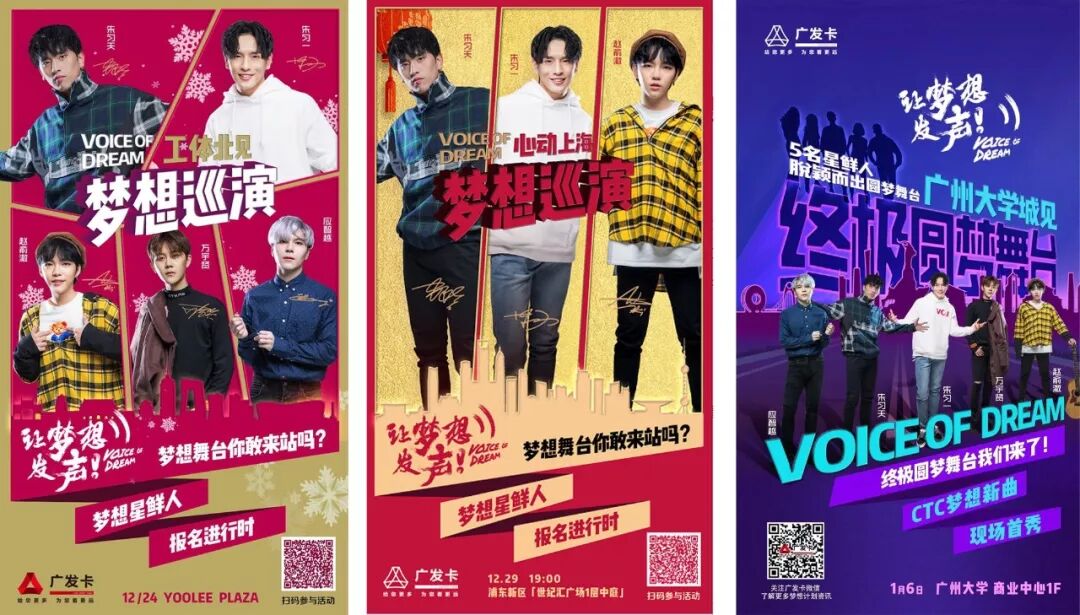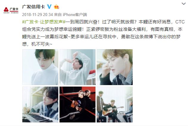 去年底,广发信用卡全网发布“让梦想发声”活动,希望投资有梦想、有态度的年轻人实现梦想,意外发现曾参与《偶像练习生》的CTC男团在微博下互动发声。