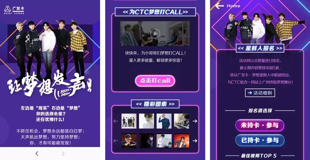 广发信用卡为粉丝提供了多重参与感:定制了一个“梦想H5”,粉丝通过为CTC男团打call可以解锁线下巡演,同时也可以报名参与活动,获得和偶像同台的机会。