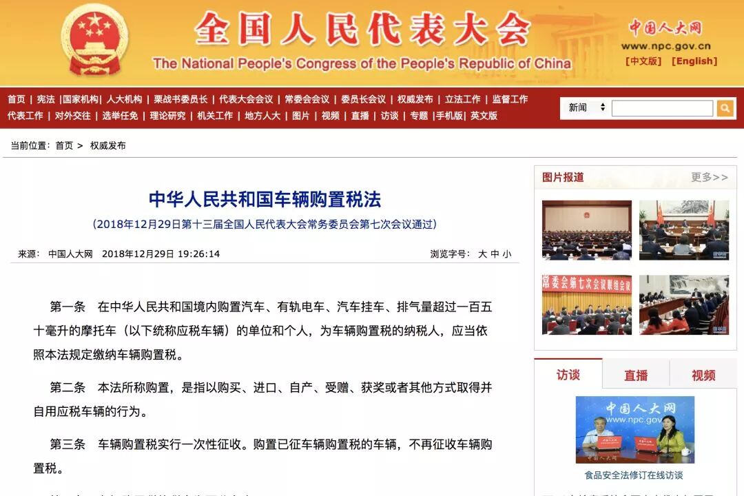 2018年12月29日,《中华人民共和国车辆购置税法》已由中华人民共和国第十三届全国人民代表大会常务委员会第七次会议通过,决定车辆购置税的税率仍为10%(已明确可免征车辆购置税的5类车辆),自2019年7月1日起施行。