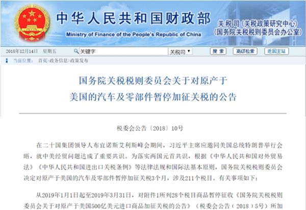 这种状况从2019年1月1日起将得到很好的缓解。2018年12月14日,财政部发布了《国务院关税税则委员会关于对原产于美国的汽车及零部件暂停加征关税的公告》称,从2019年1月1日起至2019年3月31日,对原产于美国的汽车及零部件暂停加征关税3个月,涉及211个税目。