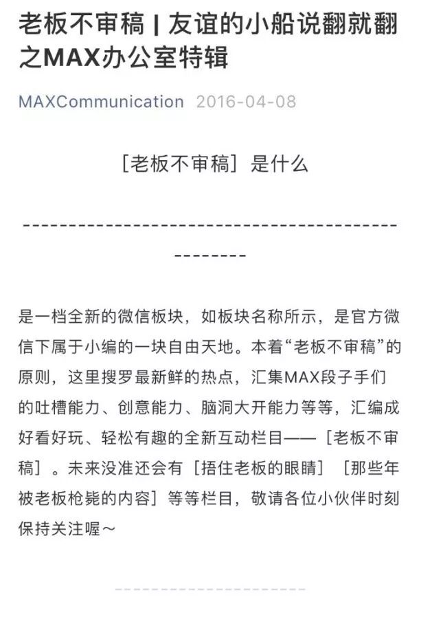 《老板不审稿》到现在为止一共做了26期。每一期都由MAX的员工自己找选题、策划内容、排版,花近两周甚至一个月的时间来完成,内容涉及MAX内部的各种有趣又琐碎的小事。