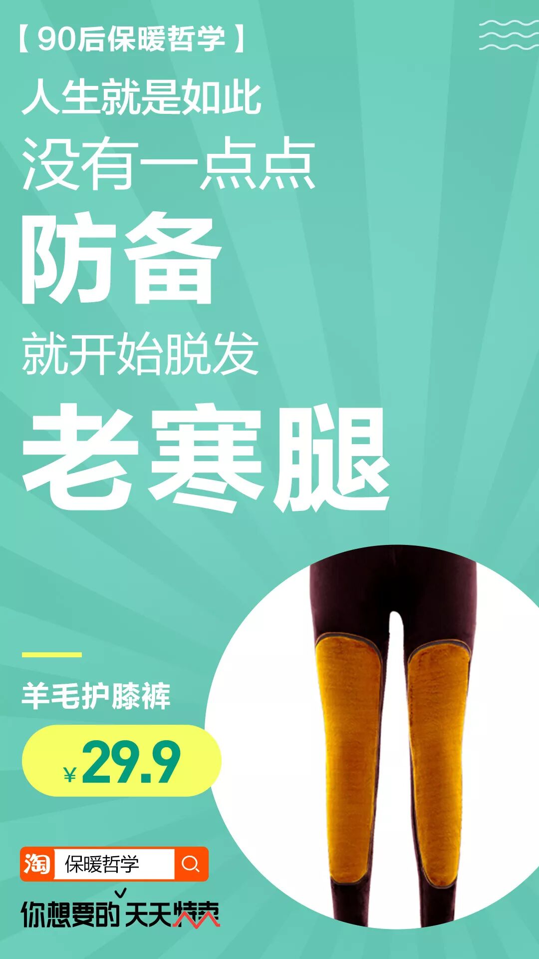于是天天特卖通过对人群的洞察,将“毛绒鞋垫”“加绒背心”“护膝保暖裤”等特卖平台上最收欢迎的热卖商品进行包装,构思出这样一组幽默又真实的创意文案,直戳90后痛点,扎心又暖心。