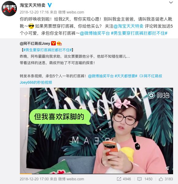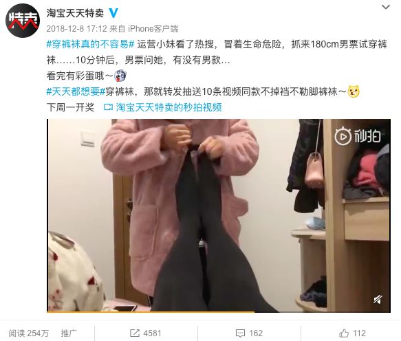 如何在数万讨论中脱颖而出?面对女生对裤袜“容易掉裆、对粗腿不友好”的吐槽,天天特卖刻意制造「反差」,以“男生穿裤袜”的视角,结合平台爆款,快速推出180男生穿裤袜的趣味视频,在戏谑搞笑中表达该款商品的高弹性不掉裆的核心价值。