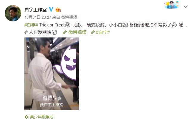 去年万圣节之夜白宇哥哥COS了一把小丑,在北京10号线里给粉丝们发起了糖果。