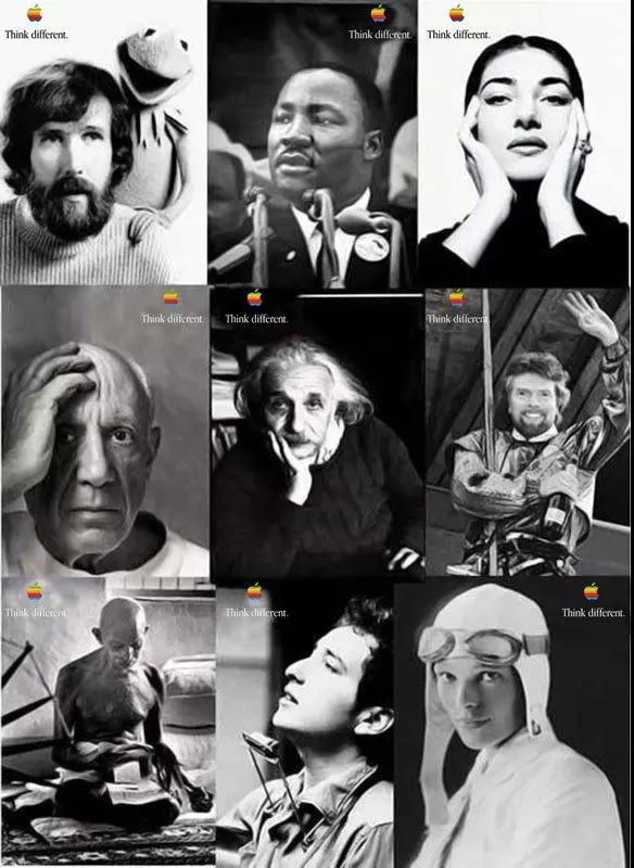 这就是仿效IBM《Think IBM》制作的《Think Different》,彩虹色的苹果logo与黑色照片形成鲜明对比,画面上是爱因斯坦、爱迪生、甘地,还有一张反越战游行时鲜花塞住枪管的照片。配乐激动人心,“We’re never going to survive unless we get a little crazy”。它只想告诉人们,和这些思想上最不同于常人的伟人一般,苹果曾被捧上神坛,也被无情嘲讽,但它始终是为真正的远见者量身定制,他们持有不同的想法,也敢于逆流而行。