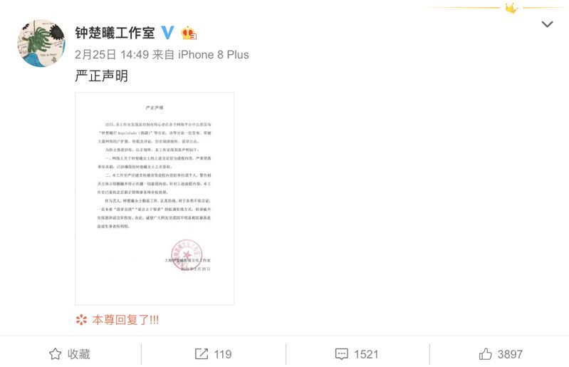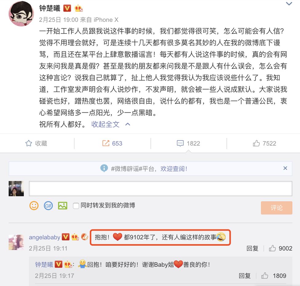 钟楚曦工作室25号突然发声明,说最近的#钟楚曦打Angelababy#的言论是谣言,自己已经委托律所处理了。