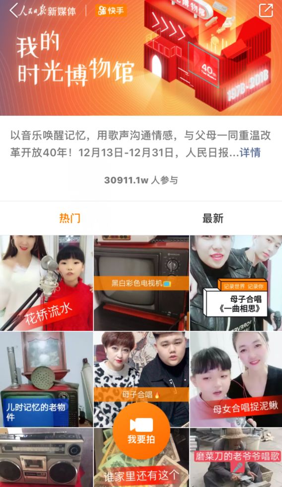 与此同时,人民日报新媒体还结合年轻受众的触媒习惯,在快手APP上发起#我的时光博物馆#话题,邀请KOL探馆体验,并面向大众征集带有年代印记的老物件视频,调动了大众的参与热情,目前该话题参与人数已经超过了3亿人次。