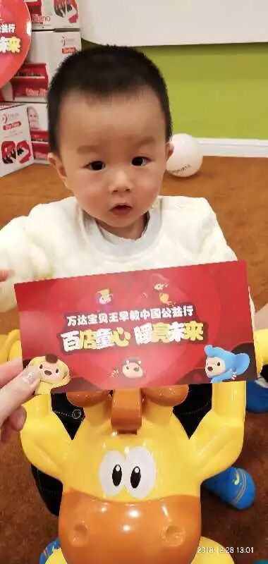 注意到没,孩子们的手里,都拿着一张红色卡片,上面写着“万达宝贝王早教中国公益行——百店童心 暖亮未来”。