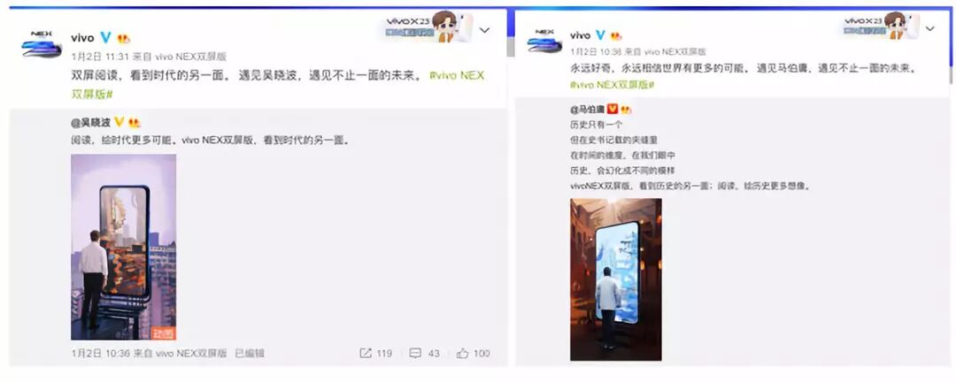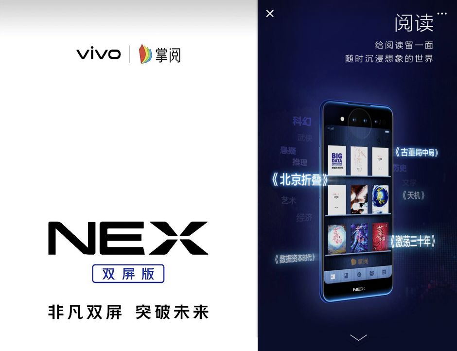 掌阅强大的作家资源和优质内容,对希望提升品质感的vivo 有着非常大的吸引力;NEX双屏版推新上市,本身具备大流量和强曝光属性。双方的结合,基于合适的内容基础,借势扩大自己的品牌声量,无论于vivo 还是掌阅,都打响了19年漂亮的营销第一弹。