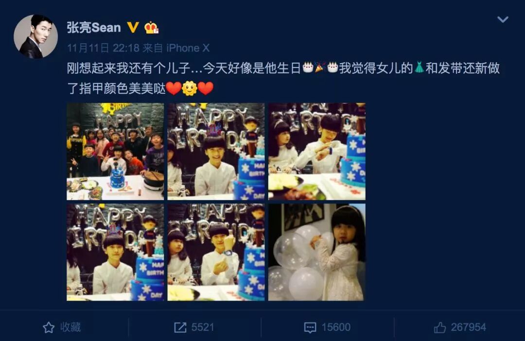 在儿子天天生日的时候,作为老爸的张亮为儿子庆生,并在微博发文表示:“刚想起来我还有个儿子……今天好像是他生日。我觉得女儿的裙子和发带,还新做了指甲颜色美美哒!”