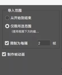 如果视频过长的话Ps可能无法完全导入。在导入窗口里进行设置,限制导入的帧数。你可以选择导入整个视频,或是导入视频的一部分。你也可以选择跳帧导入,例如每隔两帧导入一帧。