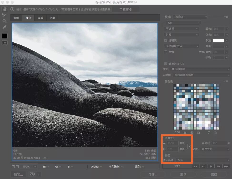 如果你要在网上使用这个动图或想减小文件大小,可以在图像大小中更改宽度和高度。循环选项选择永远。