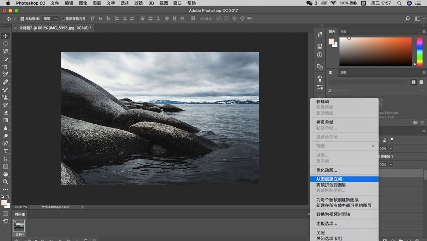 点击时间轴面板右上角的菜单按钮,点击从图层建立帧。现在你的图层照片就变成动画里的每一帧啦! 接着点击下方的播放按钮或敲打空格键进行播放。