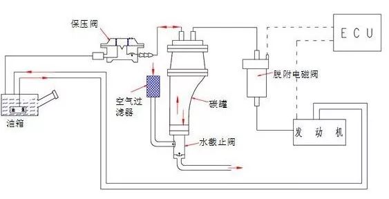 碳罐另一端与发动机进气歧管相连,中间有一个电磁阀控制管道的开闭,在合适的时刻打开,将吸附的油气送入发动机燃烧掉,这样既不污染环境又节约能源。