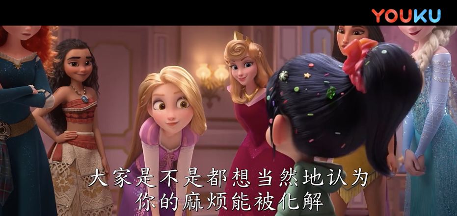 迪士尼这次还玩了一个大梗:让自己的王牌公主们在这部动画片里来了个世纪大同框,还不忘顺带着自黑了一下……