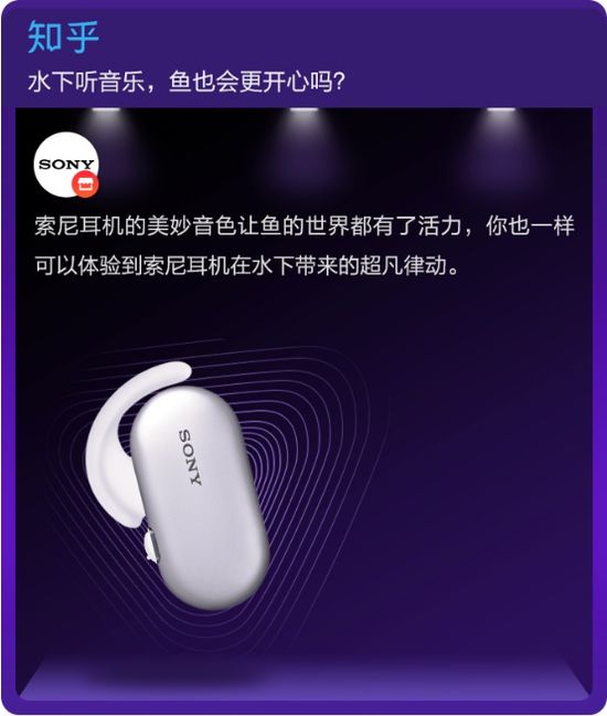 如:京东为推广索尼一款无线防水耳机,与知乎一起进行了“新知妙想 + ”的探索实验,以“水下听音乐,鱼也会更开心吗?”的问题开启用户好奇心(引起注意、兴趣),通过探索水生动物对音乐的反应突出耳机防水、无线的特点(产生欲望、达成记忆),种草观众(购买行动)。