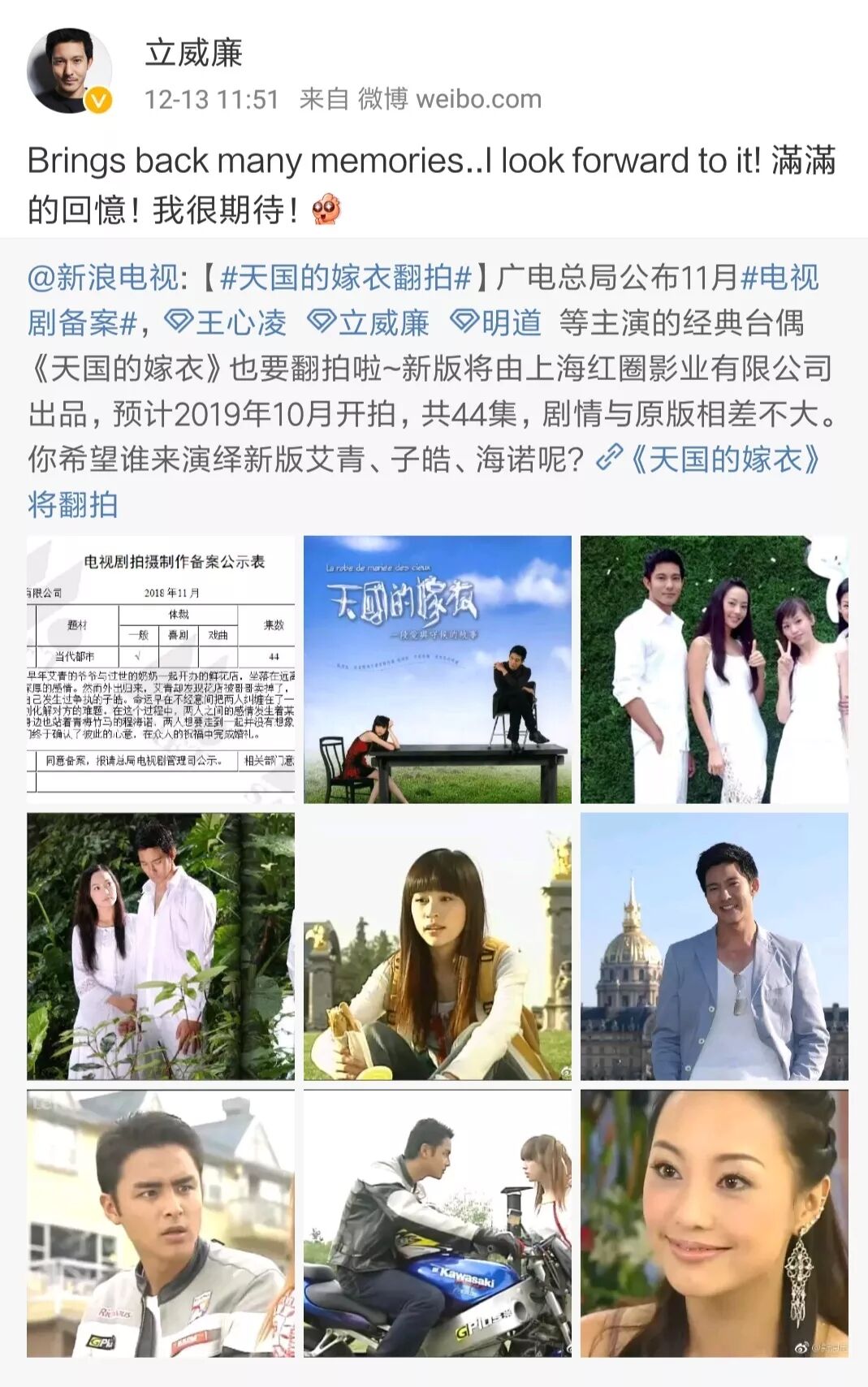 《天国的嫁衣》时隔14年将被翻拍的消息本周爆出后就瞬间传遍网络,作为曾经的主演的立威廉和明道也纷纷表示,自己的作品被翻拍,很开心很期待!