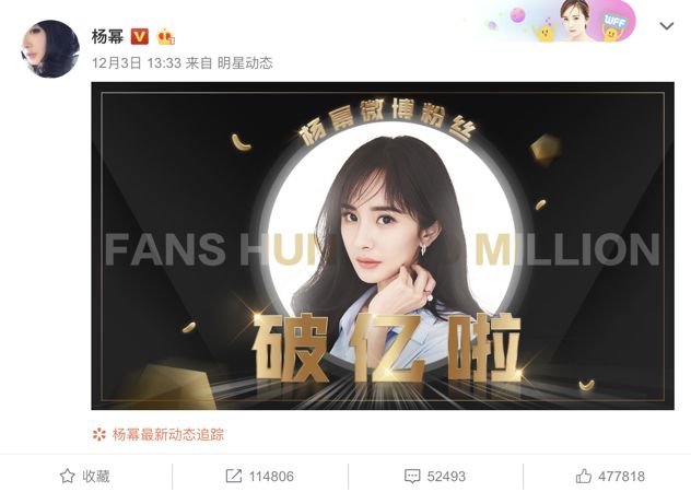 3号中午,杨幂微博粉丝正式破亿!成为继谢娜何炅之后微博粉丝破亿的第三人。(此处应该撒花