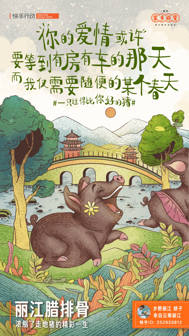快手联合广州无二数字营销为丽江腊排骨制作了品牌升级系列案例,其中的五个GIF海报的主题围绕着“一只过得比你好的猪”,打出了一组戳心的社交传播连环击,迅速同大城市的加班人产生共鸣。