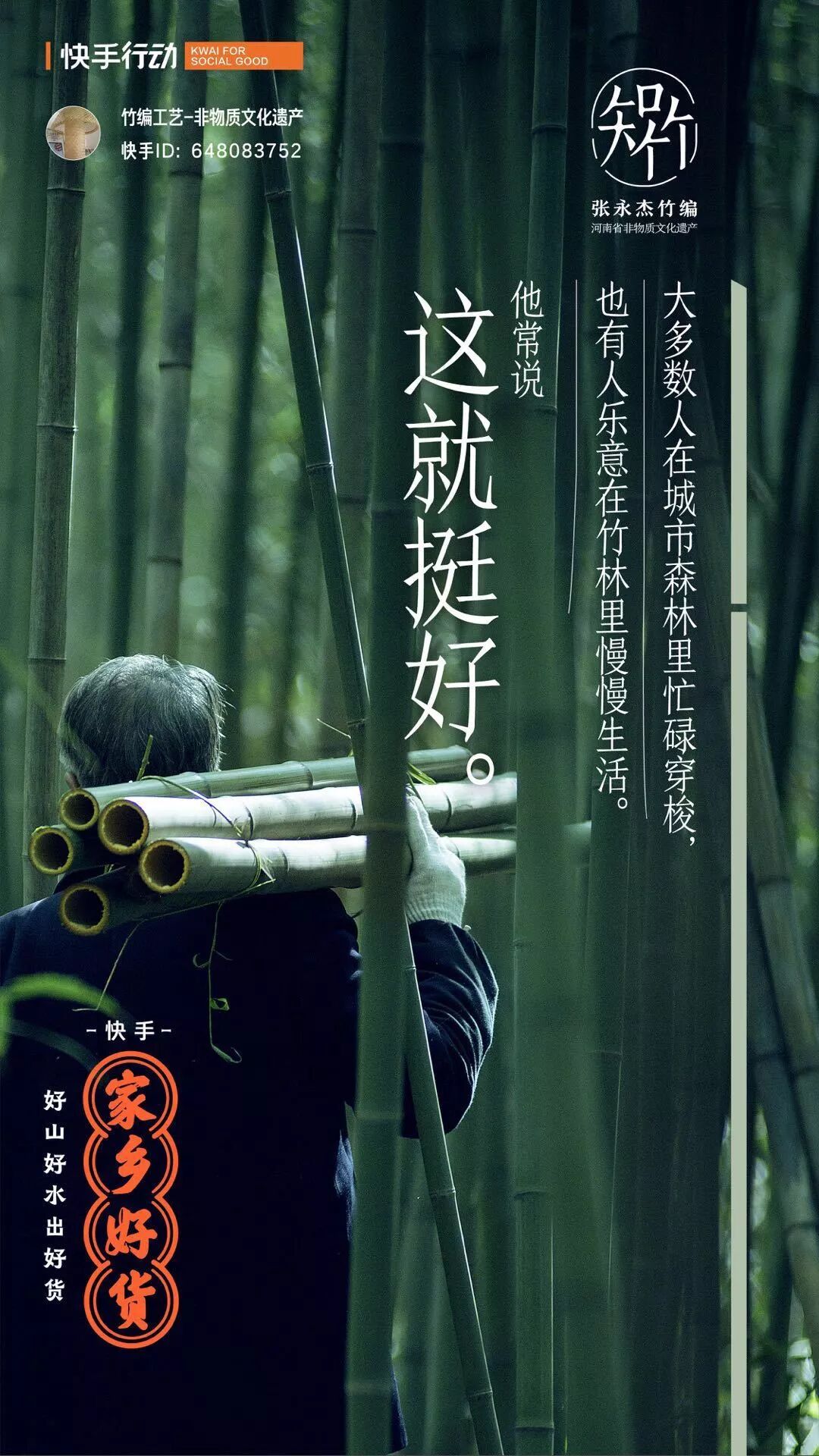 快手联合上海胜加广告为洛宁竹编制作了以“知竹”为主题的系列案例,人和品牌气质符的创意,才能真正的传递有效的信息。张永杰的口头禅是“就挺好”,透着一种云淡风轻的知足,那么简单纯粹。而这个系列的海报,话里话外有滋有味,真挺好。