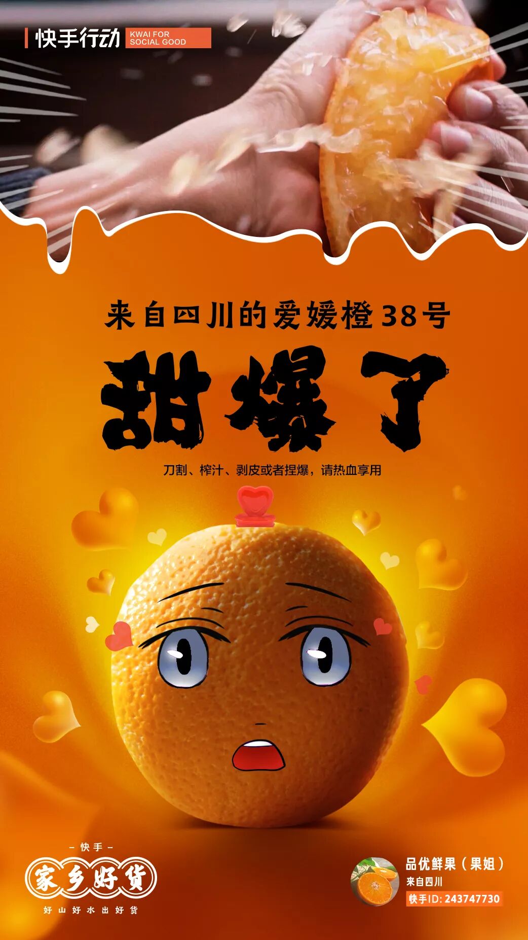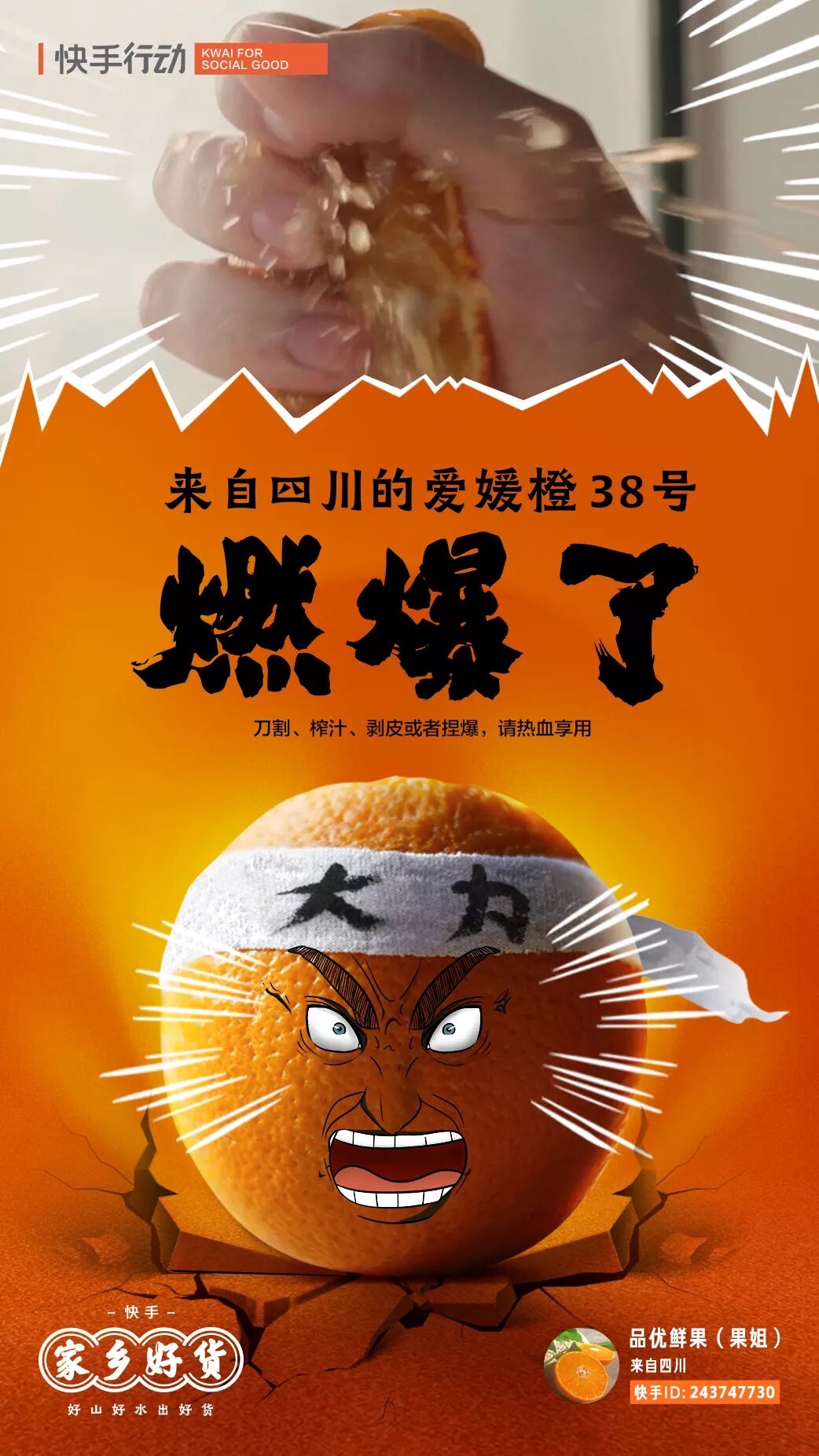 这是快手联合北京阳狮为快手用户@品优鲜果(80后农二代)(快手ID:881548400)的爱媛橙38号,进行品牌升级案例中的一则视频广告,“二次元”、“燃文化”、“小确丧”,这支网感十足的创意作品,用有趣的内容,将“爱媛橙”推向一线受众,让粉丝玩转花式吃橙,从而提高销量,带动村里的贫困户一起发展“家乡好货”的柑橘事业。