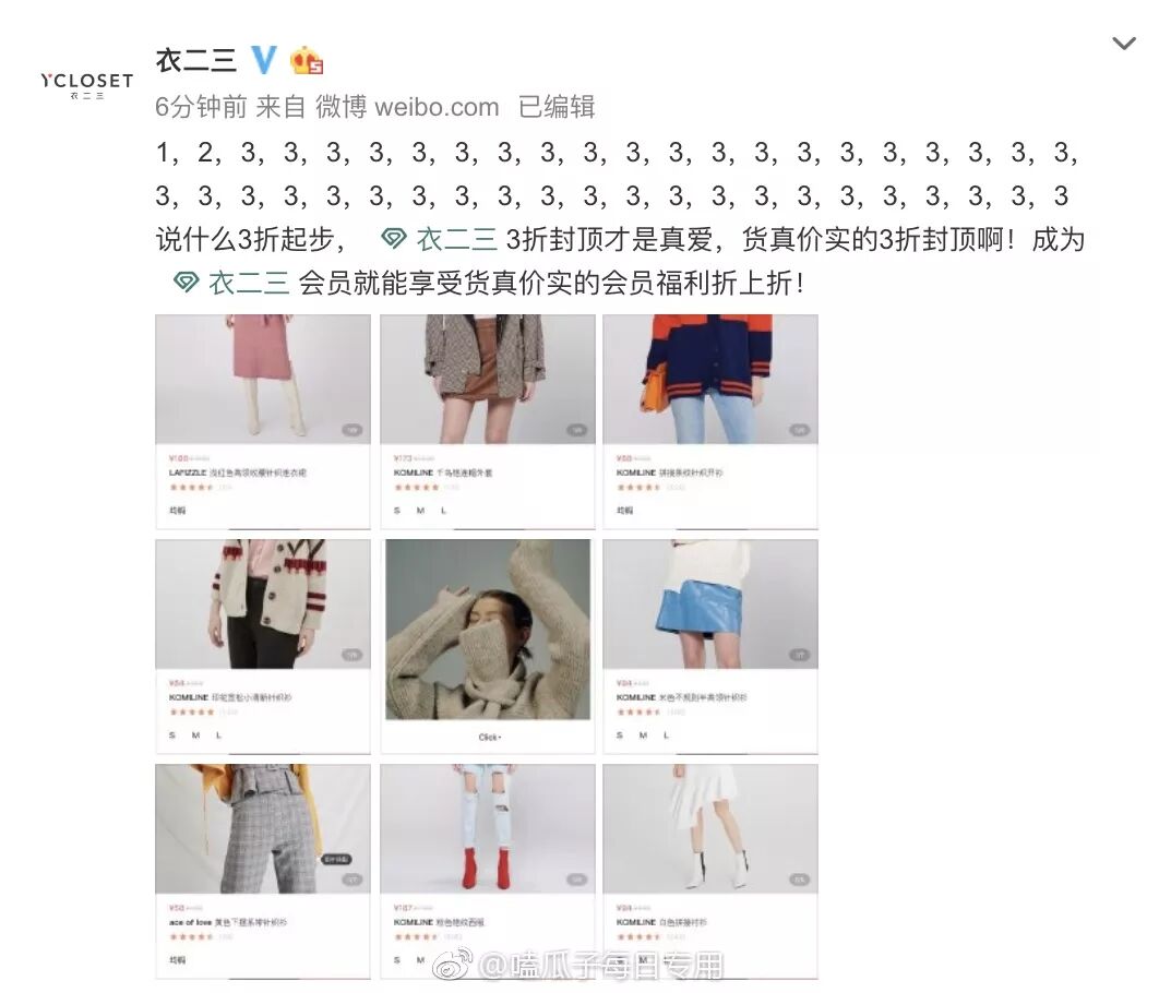 而实际上,这逼死密集恐惧症的333攻势是来自唯品会。为了给12月8日的特卖大会造势,唯品会用“1.2.3.3.3.3.3.3.3....”告诉大家:惊爆价,惊爆价,唯品会特卖大会3折封顶,3折封顶... 瓜吃到这里,一脸懵逼的店长似乎明白了一些。
