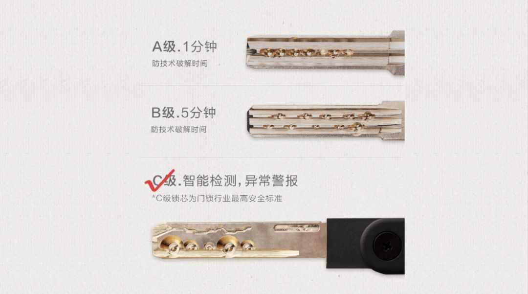 根据相关标准规定,锁芯分为A/B/C三个等级,其中A、B级锁芯开锁难度低安全性较差,C级为安全规格最高等级。小米米家门锁采用真插芯的C级智能锁芯,真插芯就是一个真实的锁芯贯穿锁体,即使外面的面板被破坏,内部依然是完整的机械锁,需要钥匙才能开锁,给你高等级的安全防护。