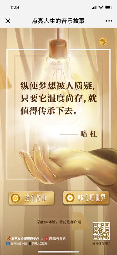 除了能点亮你自己的人生, 网易云音乐还联合人工智能团队共同策划了一个体验项目“AR心灯世界”,用户通过点亮“心灯”,就会随机听到丁磊、马东、黄渤、高圆圆、暗杠、杨紫、武大靖、蔡徐坤等不同年代不同领域的名人讲述他们自己与音乐、与时代的故事。