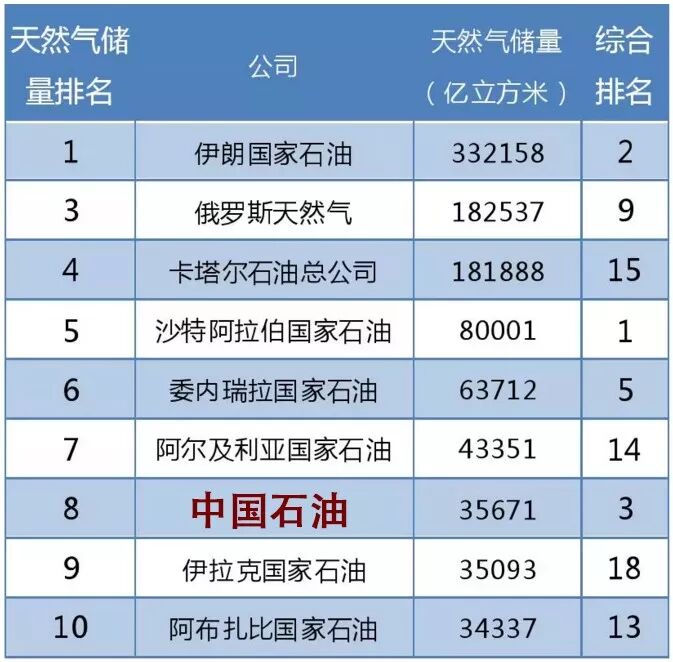 伊朗国油拥有全球最大的天然气储量。前10名共拥有102万亿立方米天然气储量,占前50大石油公司总储量的82%。