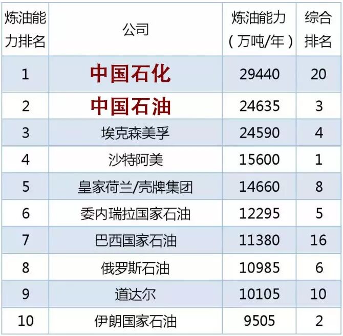 炼油能力方面,中国石化和中国石油的炼油产能位列前两位。