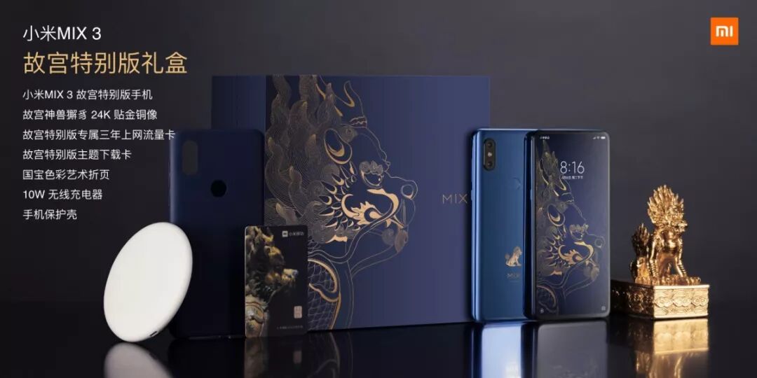 小米MIX3 故宫特别版礼盒内含:小米MIX3 故宫特别版手机(10GB内存)、故宫神兽獬豸24K贴金铜像、专属小米移动流量卡(连续三年每月赠送10G高速流量+20天全球主流国家免费上网)、10W无线充电器、故宫特别版主题下载卡等。