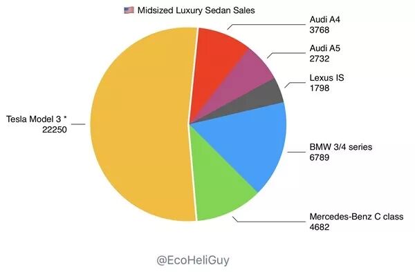 而单论Model 3一款车的销量,也成功地占到了美国中型尺寸豪华轿车52%的份额,奔驰、宝马、奥迪、捷豹、雷克萨斯一起上也没打过。