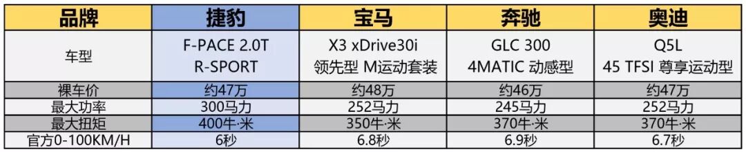 不过,你先别被标价牌上的60.8万吓到,因为F-PACE的性价比,只有你在走进4S店之后才能体现——目前,这辆捷豹F-PACE 2018款 改款2.0T 300PS 四驱R-SPORT运动型 终端裸车价在47万左右。这是什么概念,看下面的表格就知道了。