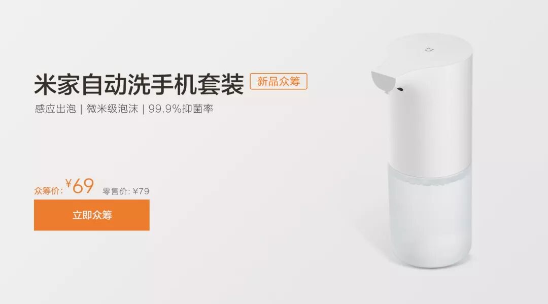 米家自动洗手机套装火热众筹中!①极简低调,荣获 2018 优良设计奖 ;②无需按压,自动感应出泡;③抑菌率达99.9%,有效抑制日常细菌;④微米级丰盈泡沫,深度洁肤;⑤微酸性配方,温和亲肤不紧绷……零售价79元,众筹价仅69元!详见:来,伸手!送你100套米家自动洗手机套装!