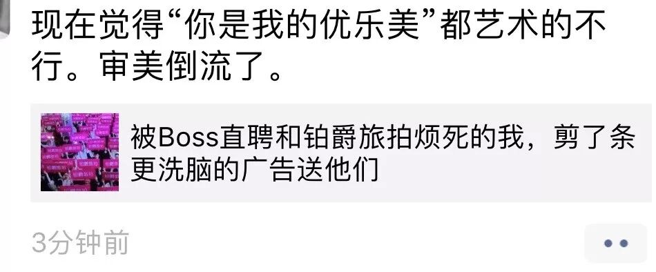 这么一看,Boss直聘和铂爵旅拍的创意方已经圆满地完成了任务。我们在骂得欢脱的时候,创意方说不定已经开庆功宴了,没准下一波魔性广告3.0就在路上。