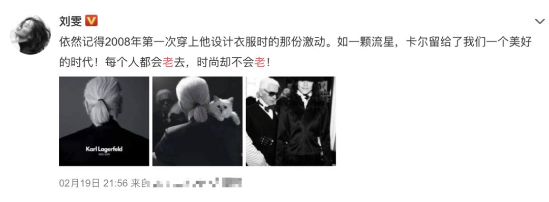 一时间贝嫂等一众名模发文悼念,国内和老佛爷有过合作交流的周迅、陈伟霆、昆凌、刘雯也纷纷发微博悼念。