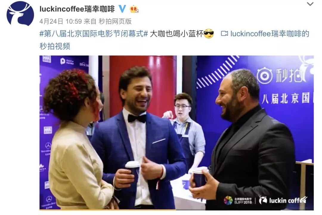 4月份,「第八届北京电影节」闭幕式上,初出茅庐的瑞幸咖啡就成为咖啡饮品指定服务商。来自世界各地的影视大咖人手一杯瑞幸咖啡,产品即广告,借助这样的场景融入,不仅仅获得这部分优质人群的接触点,更为品牌赢得了口碑背书。