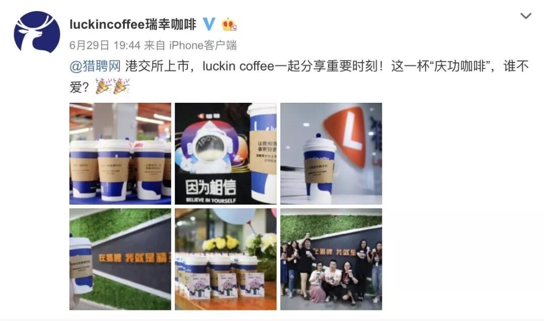 6月29日,猎聘港交所上市,瑞幸咖啡作为庆功咖啡,打入猎聘内部,积极参与庆功活动。