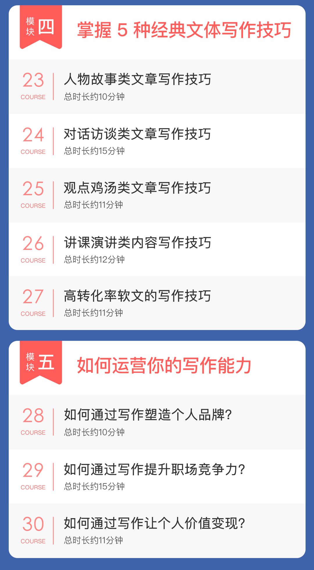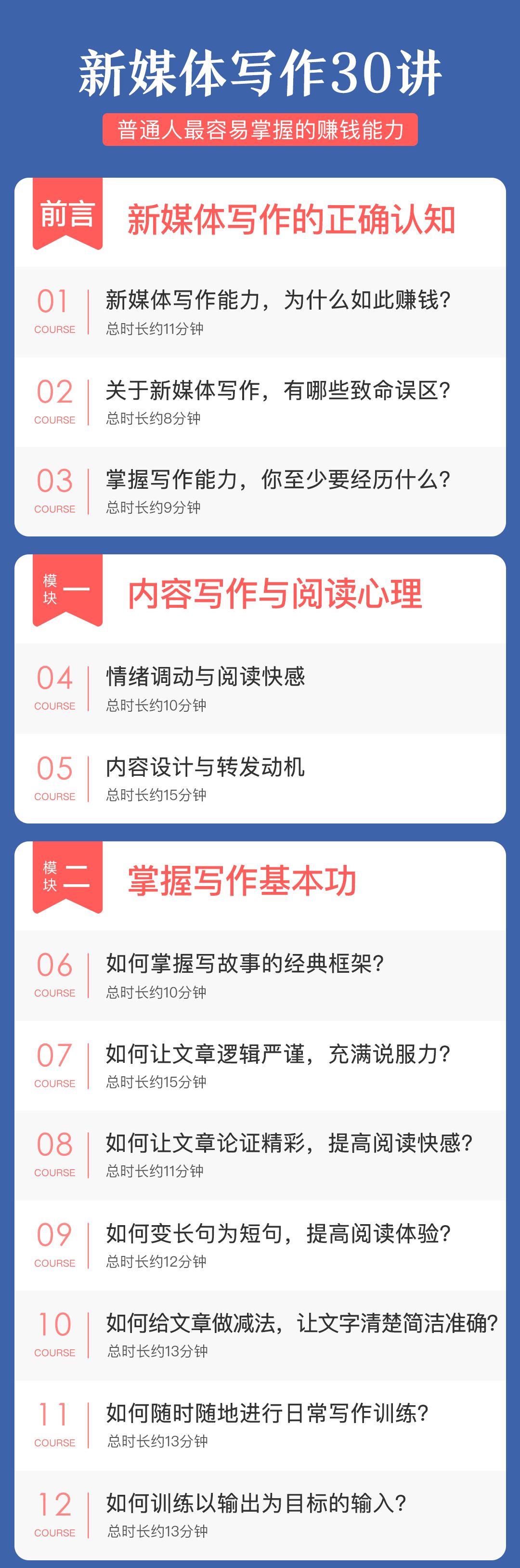 如今,我把自己这套已经成功验证过4次的方法论,倾囊相授,打造出 30 节在线课程《新媒体写作30讲》,带你从0基础开始,认识、熟悉、掌握写作能力。