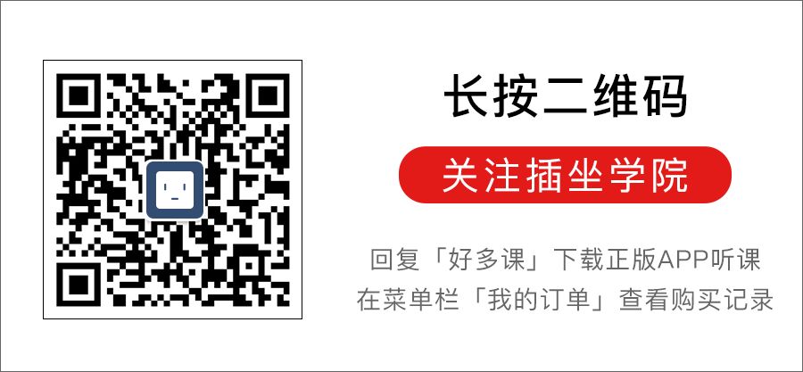 长按识别下方二维码,关注「插坐学院」,回复「好多课」下载正版APP学习。在公众号菜单栏「我的订单」可查看购买记录。