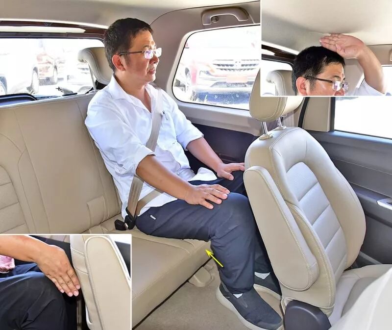 保持前排座椅位置来第二排,头部空间约1拳半;座椅支持前后调节,最靠前时腿部空间4指,最靠后时腿部空间2拳多,表现不错。