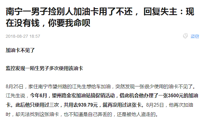 不过最近小编还看到一则更让人“不可思议”的新闻,捡到别人的加油卡后自己“盗刷”还不够,竟然还做起了生意!