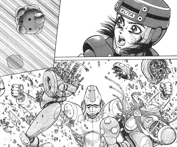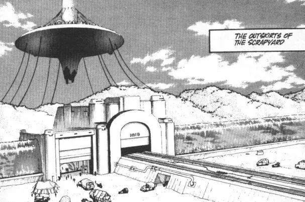 漫画开篇,一个废铁城的医生在废铜烂铁堆积成的垃圾山上找到一具少女机械残躯,她的头脑却完好无损。